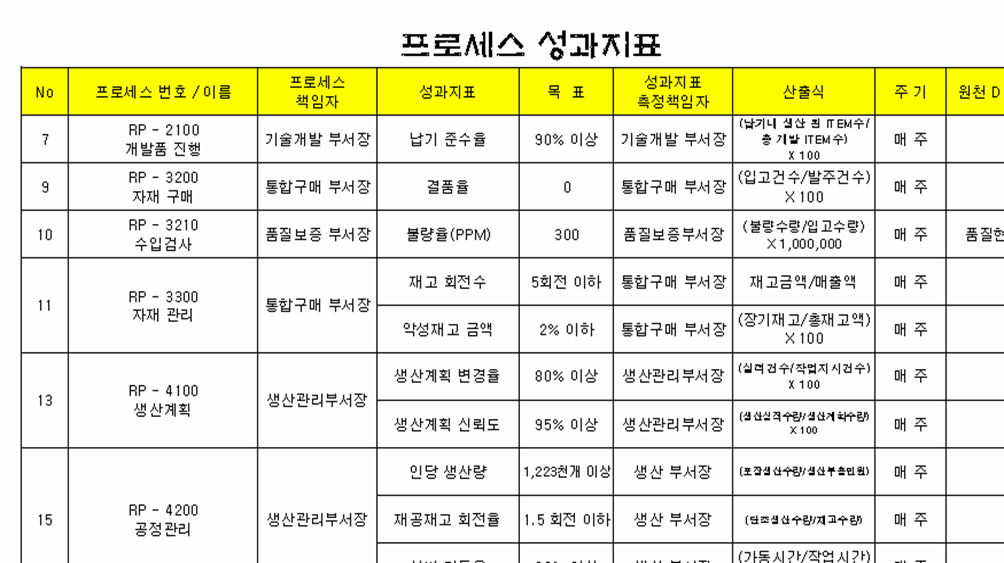 이렇게 하여 프로세스별로 성과지표와 책임자, 그리고 목표수준이 설정되었으면 성과관리체계의 골격은 완성된 것이다. 남은 일은 시스템을 운영하기 위한 구체적인 측정계획(Measurement System)을 완성하는 일이다. 측정된 데이터로 앞으로의 경향을 예측하려면 측정값이 통계적으로도 의미를 가질 수 있도록 해야한다. 가능하다면 정규분포를 따르는 데이터가 측정될 수 있도록, 올바른 측정계획을 수립해야 한다.
