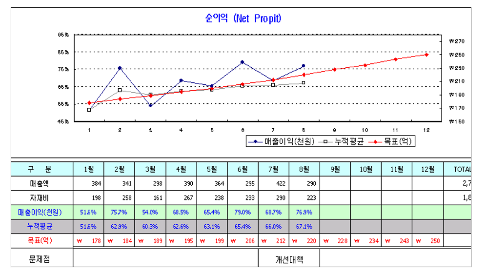 난이도 있는 통계분석방법만을 생각하게 되는 이유 중에는, 6 시그마 경영혁신의 영향도 있는 것 같다. 측정된 성과를 분석하는 데에 사용할 수 있는 정교하고 난이도 있는 통계기법이 이미 많이 보급되었다. 이들을 자유자재로 활용할 수 있다면 더없이 훌륭한 분석이 가능할 것이다. 그러나 계속 이야기하는 바와 같이, 대세를 이해하는 데에는 시간에 따른 성과의 경향을 보는 것이 중요하며, 그런 것은 그래프 정도로도 쉽고 충분히 구현할 수 있다. 성과지표의 추이를 그래프로 작성할 때 흔히 막대그래프로 표현하는 경우가 많은데, 시간이 경과에 따른 흐름의 맥을 잡는 데는 꺾은선그래프가 더 나은 표현수단임을 잊지 말아야 한다. 이행기간에 따른 실적이 누적되면, 성과를 통계적으로 분석할 수 있게 되고, 이로부터 다시 목표를 조정(피이드백)할 수 있게 될 것이다. 성과지표의 추이를 그래프로 표현할 때는 (특히 중요한 성과지표일수록)